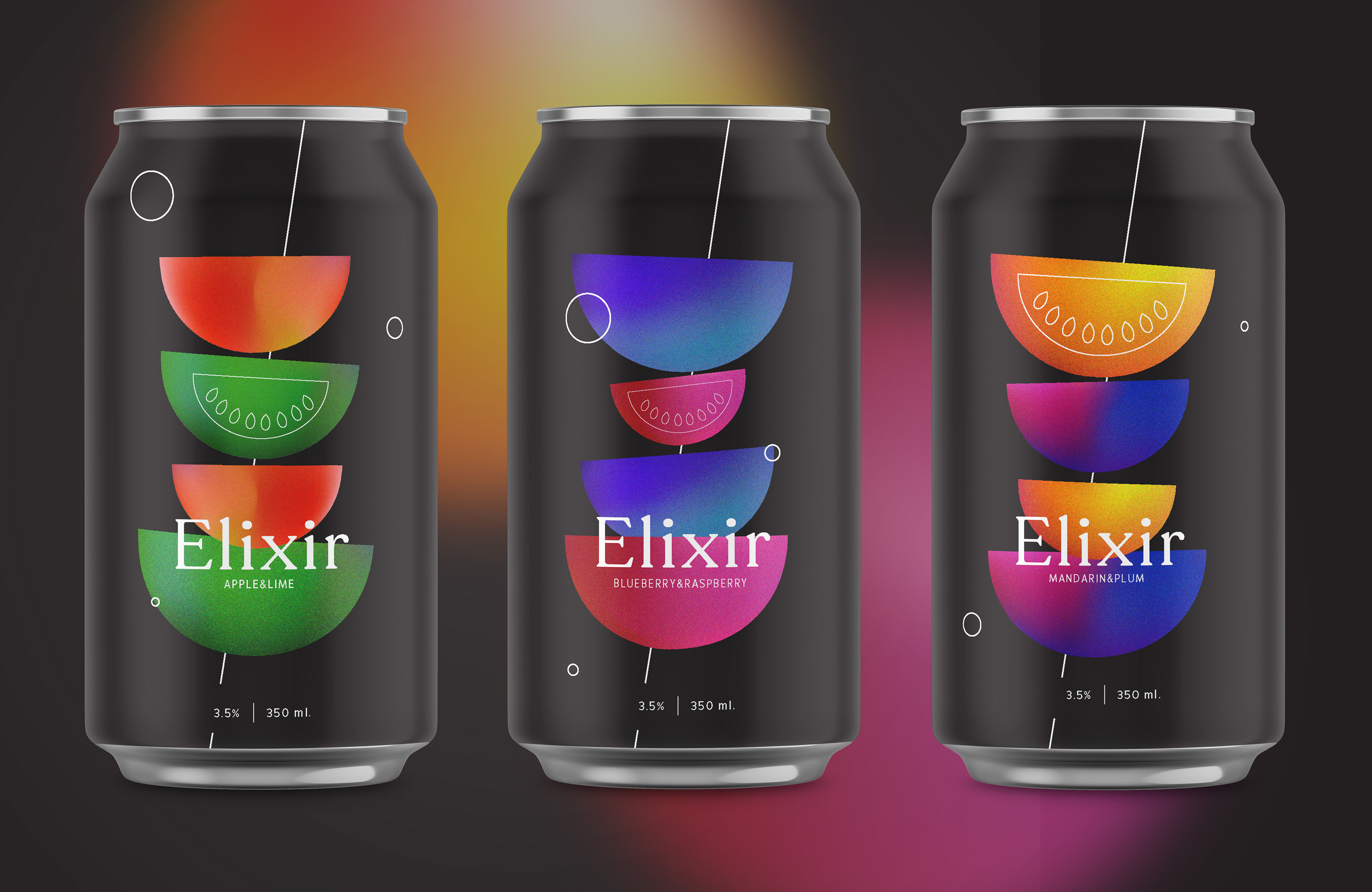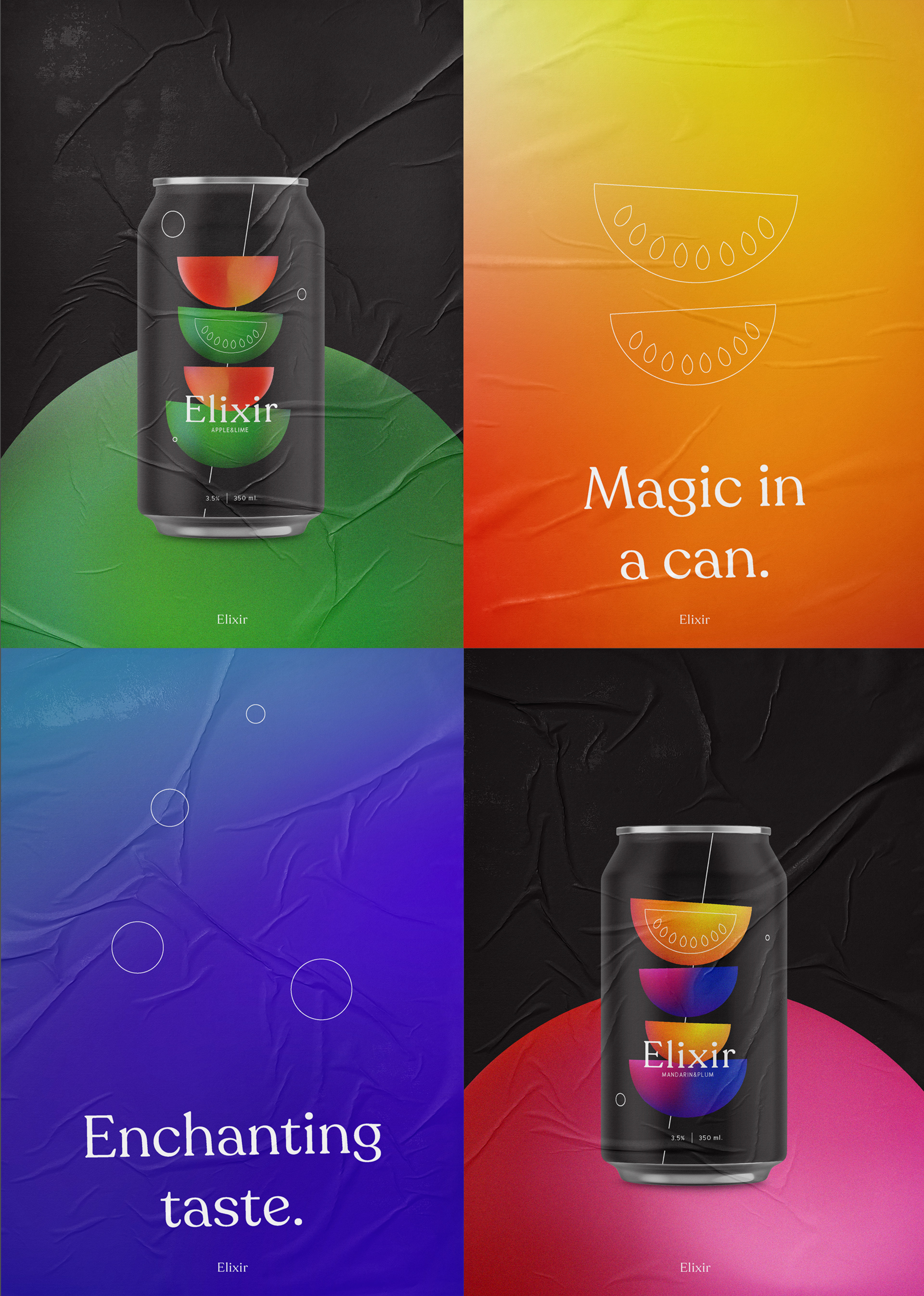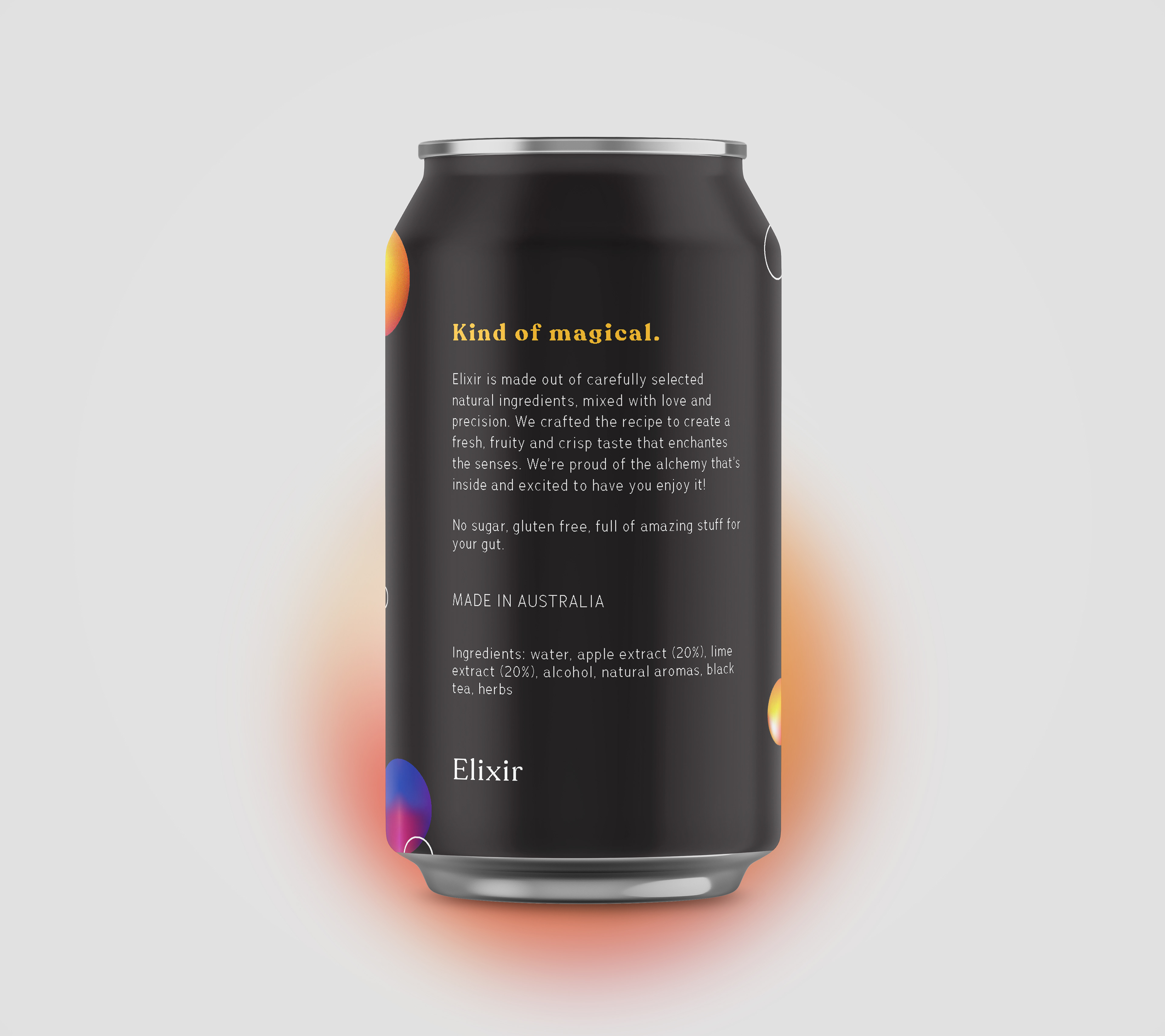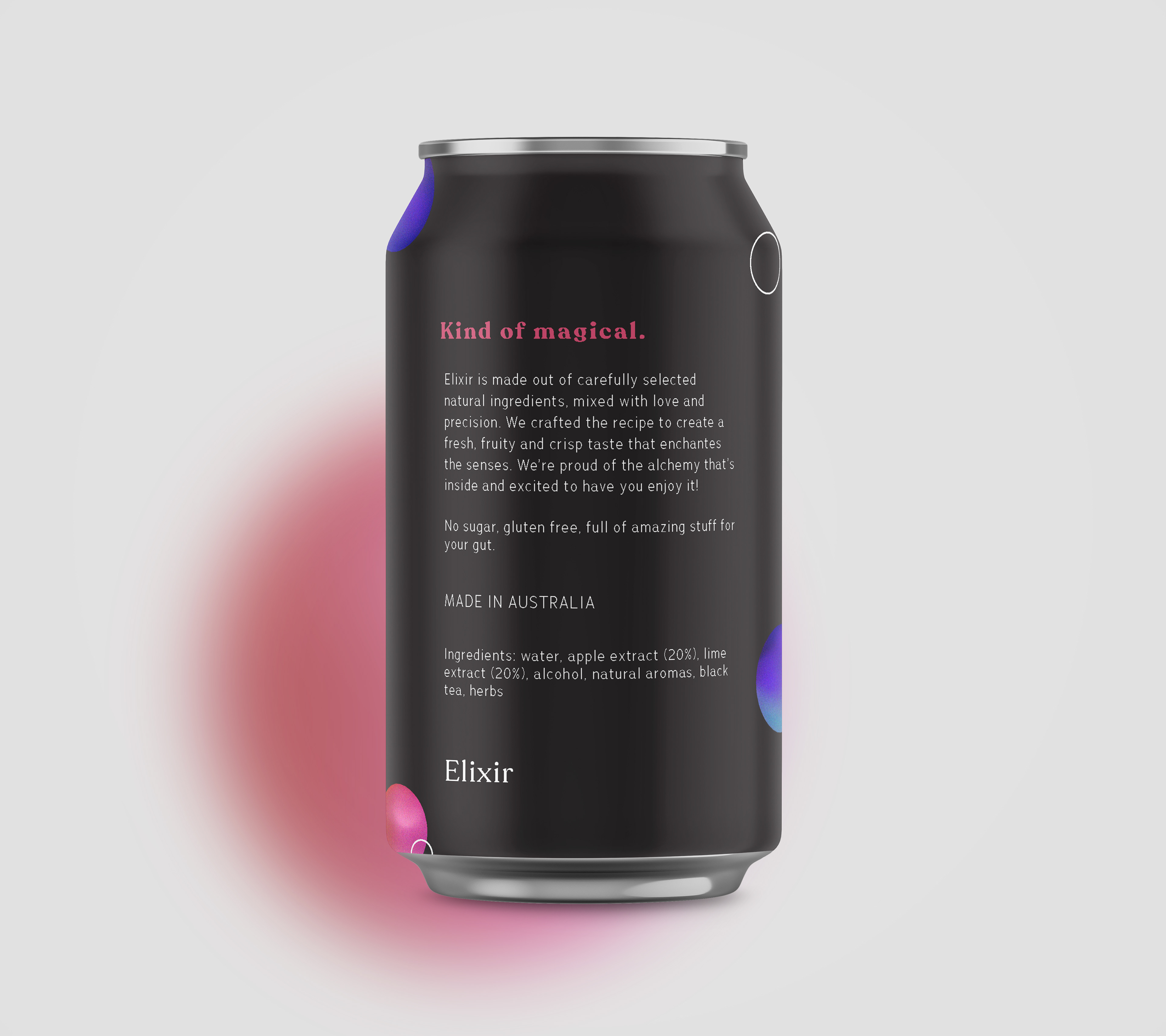 Elixir is a concept design for a slightly boozy kombucha with a magical feel. This is a passion project born out of love for the drink and vibrant gradients. The contrast of black with deep gradients and minimal line elements creates an engaging aesthetic . The simple geometric shapes represent the blend of rich fruity tones with a subtle kick of alcohol.