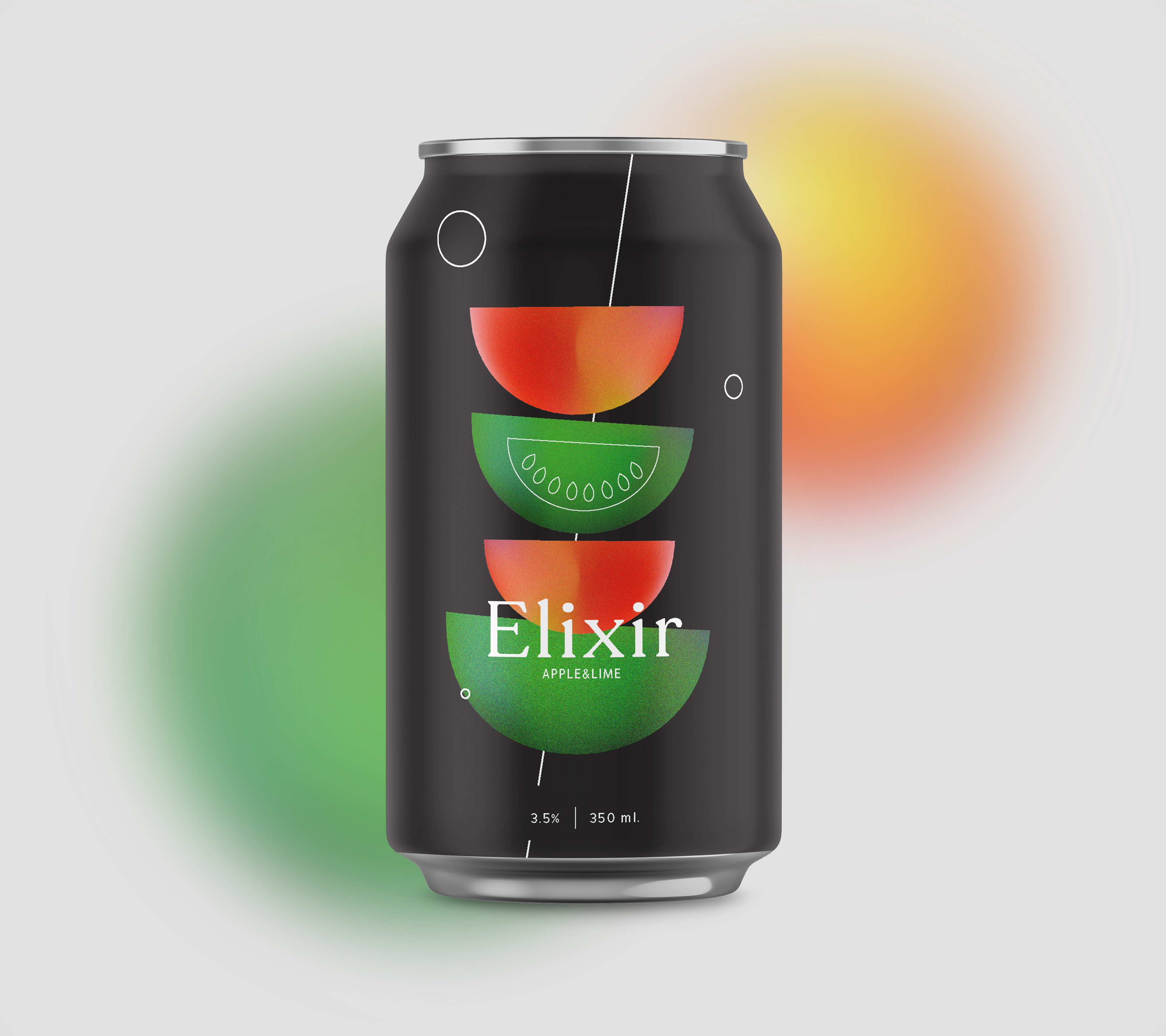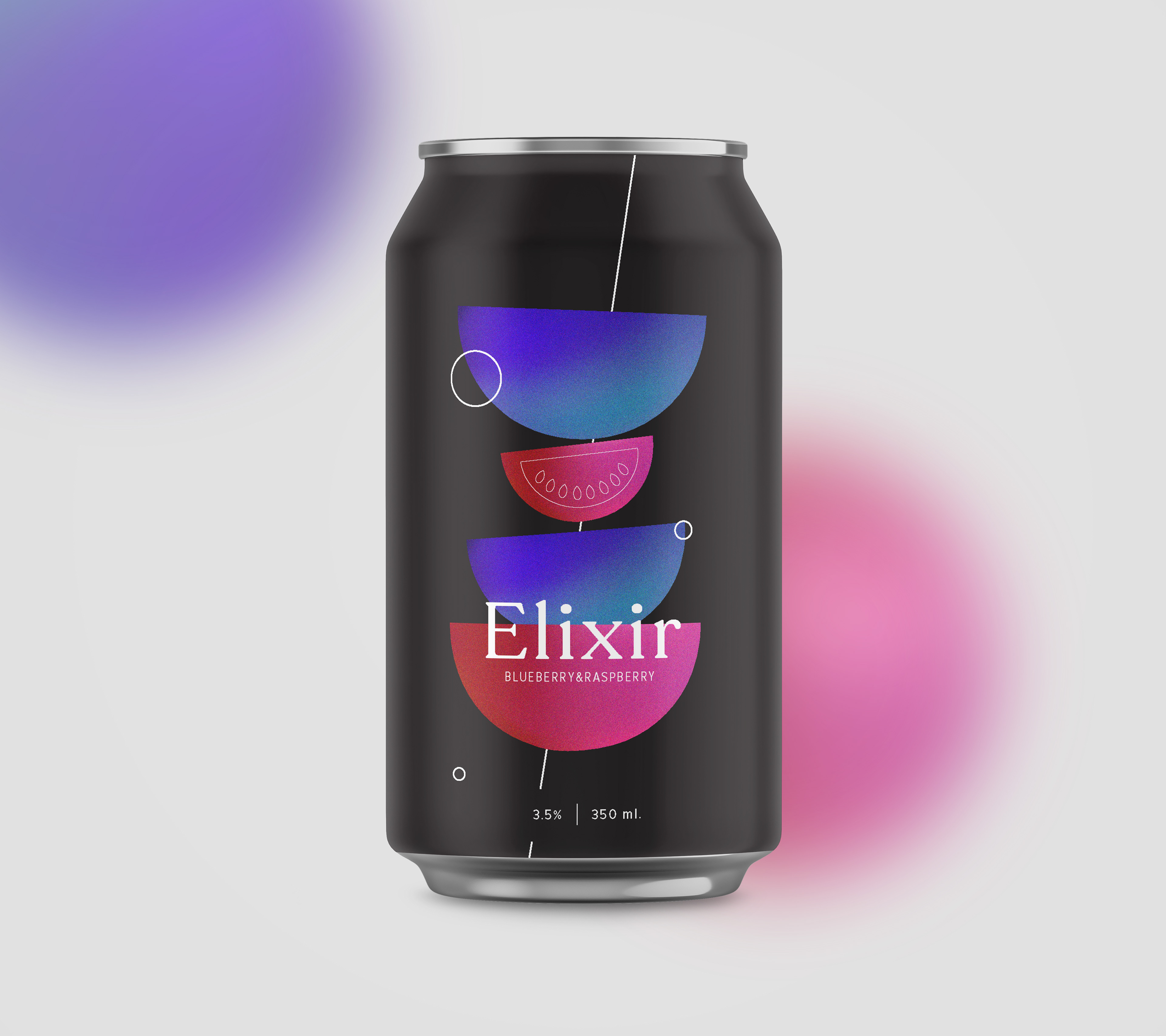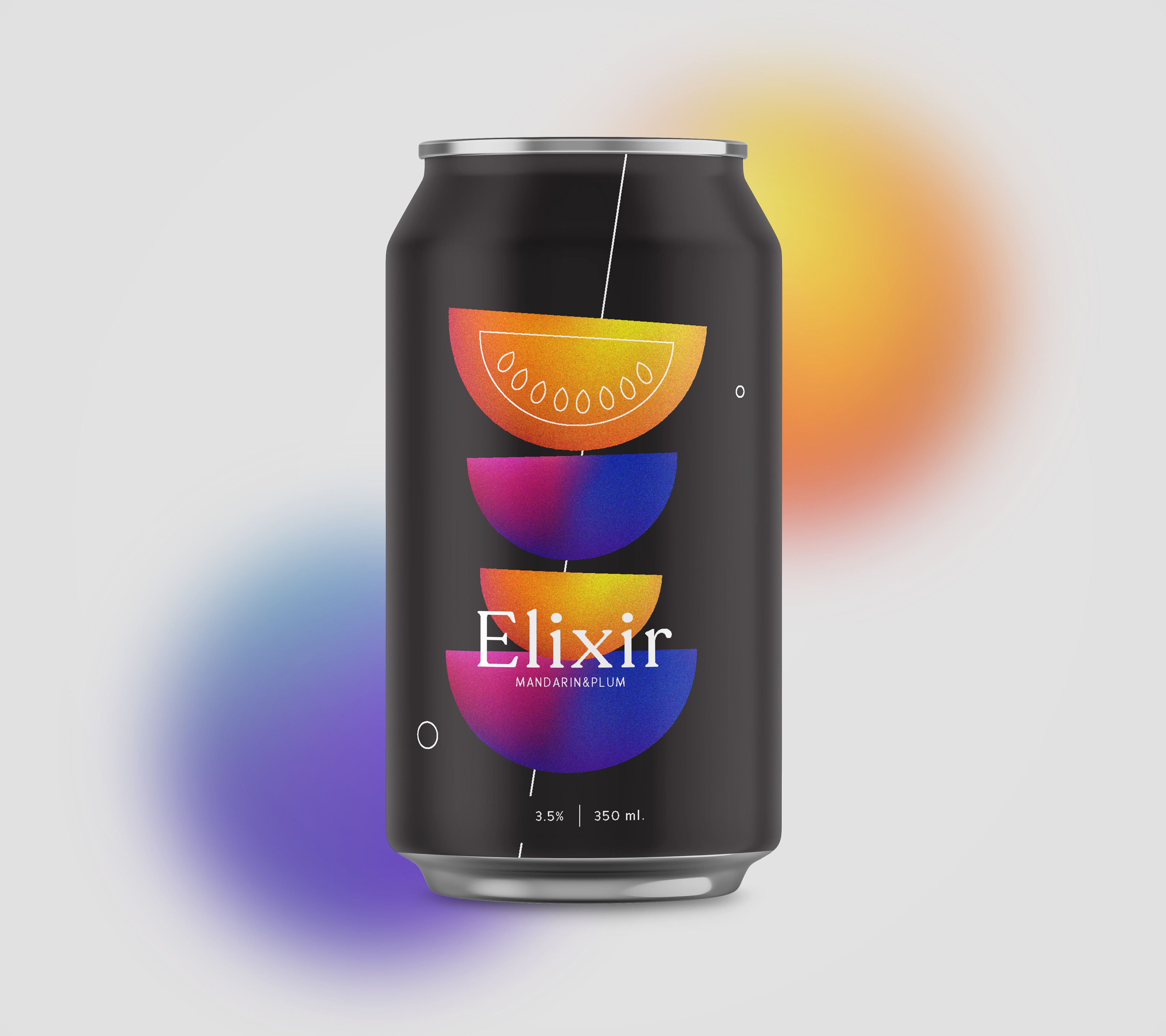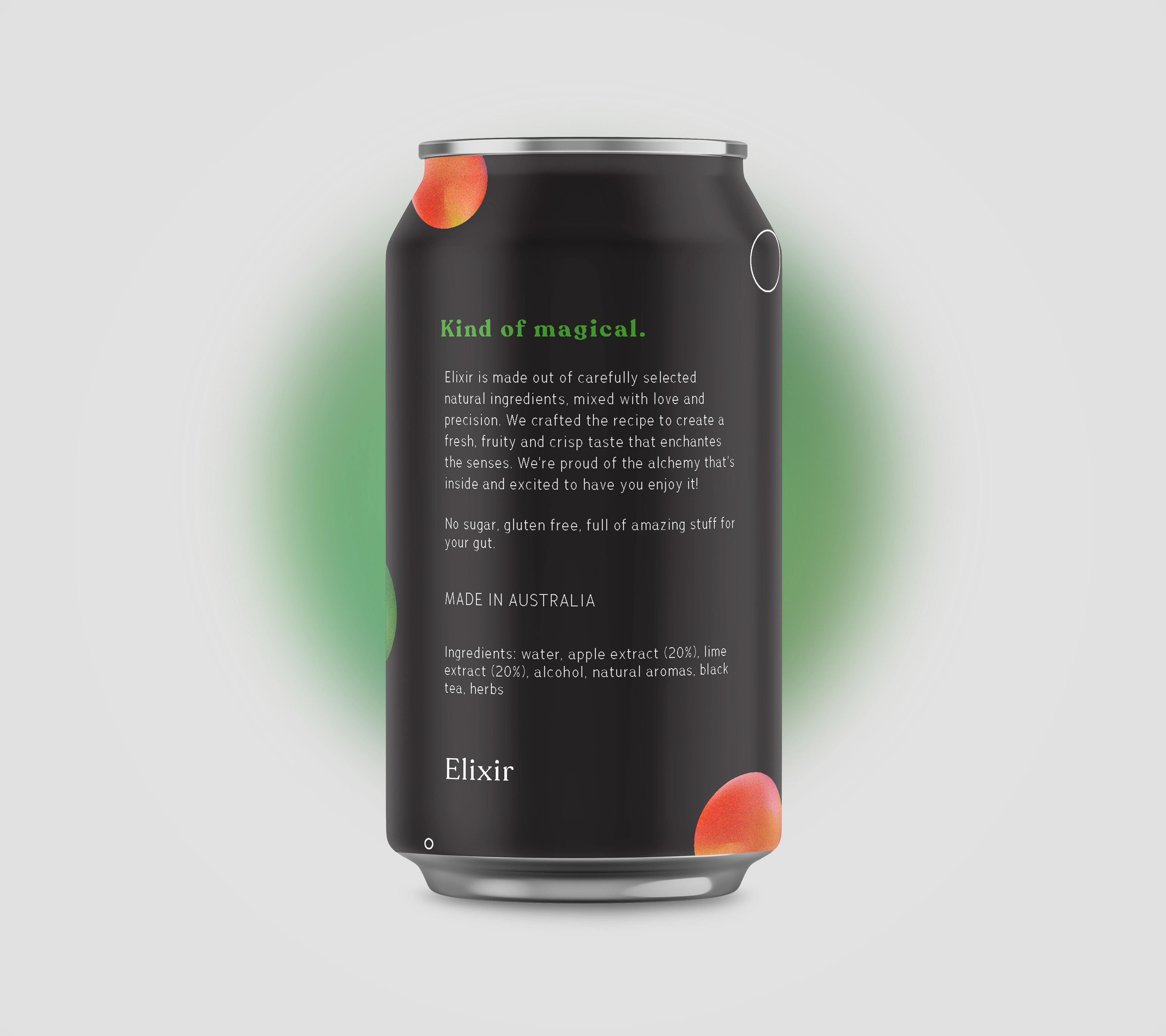 Elixir is a concept design for a slightly boozy kombucha with a magical feel. This is a passion project born out of love for the drink and vibrant gradients. The contrast of black with deep gradients and minimal line elements creates an engaging aesthetic . The simple geometric shapes represent the blend of rich fruity tones with a subtle kick of alcohol.