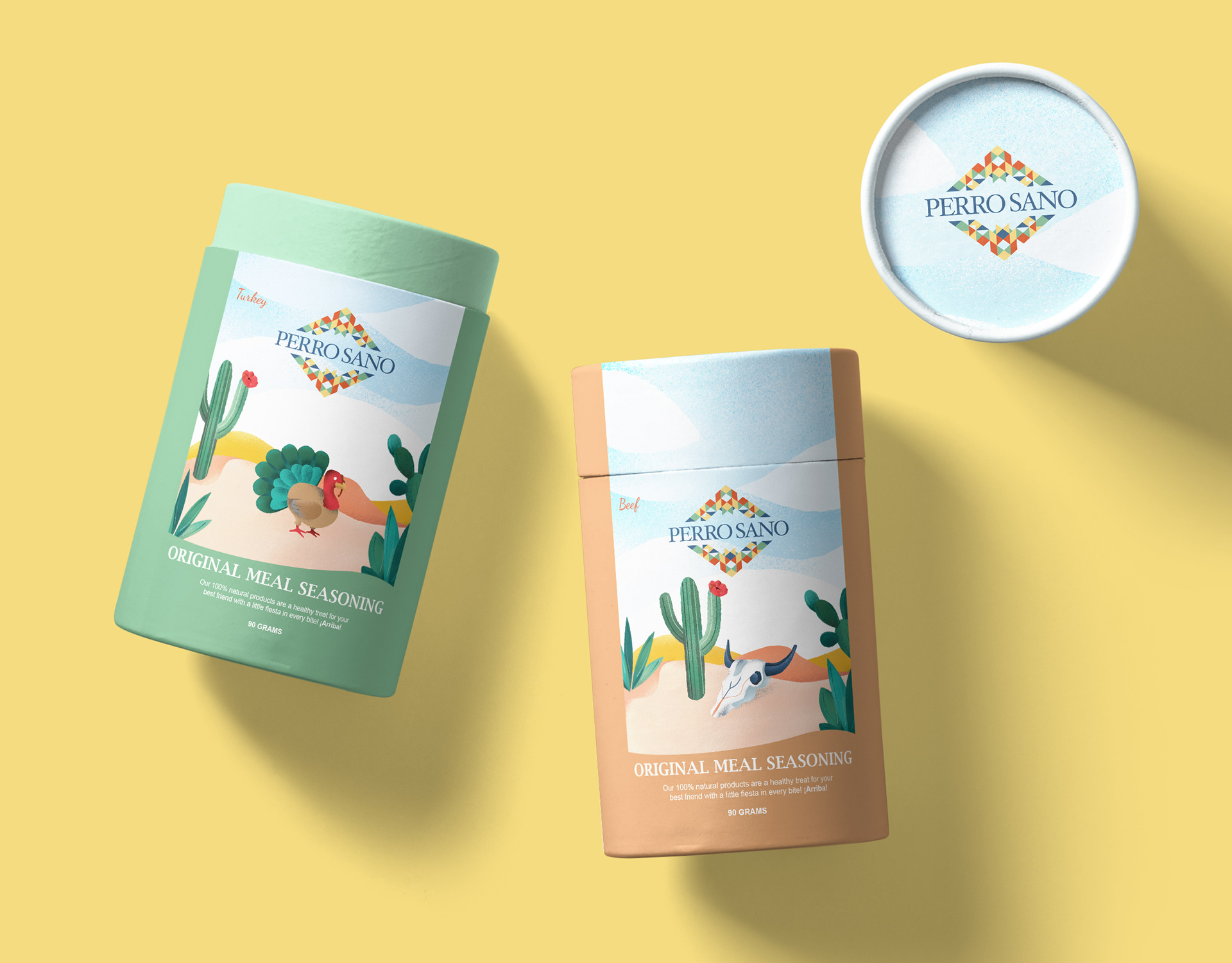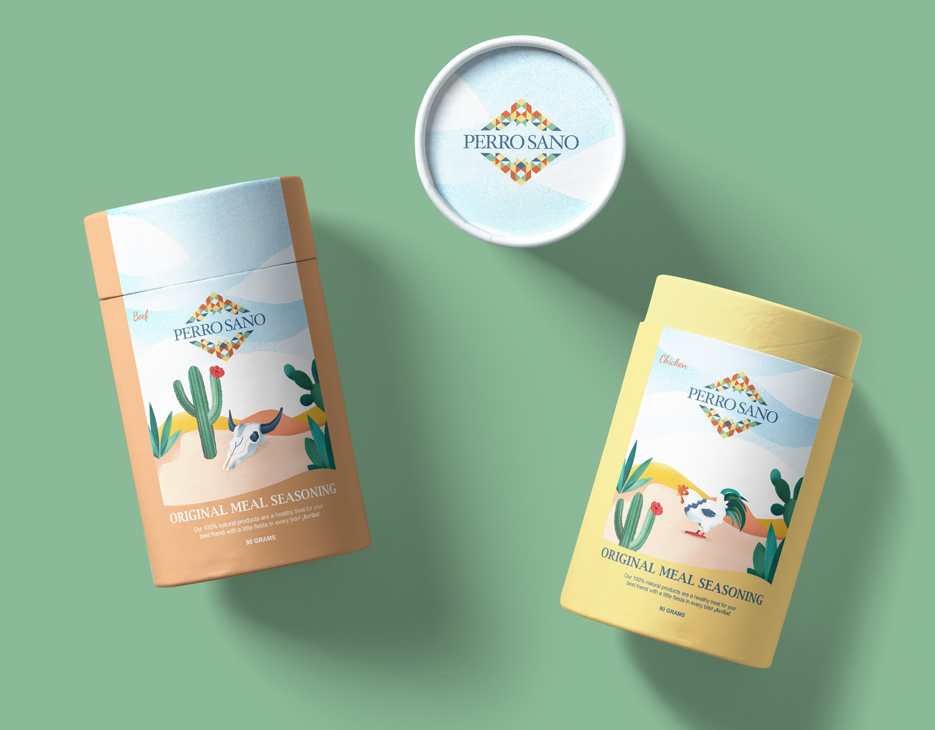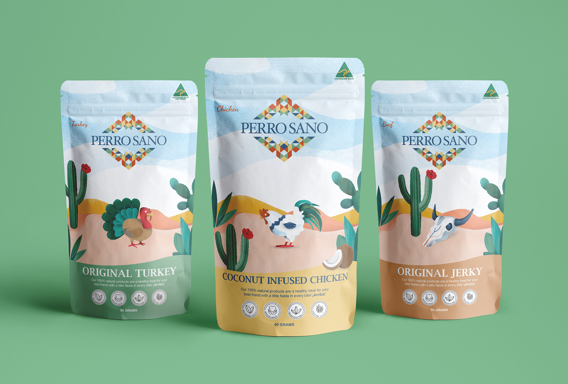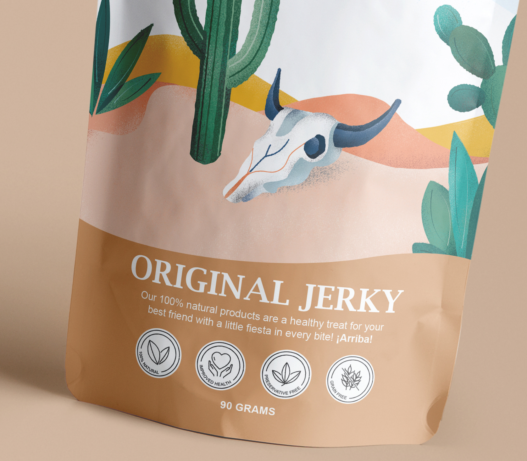 The hero of this packaging is digital illustration referencing the Mexican origin of this brand and organic ingredients of the treats. We used texture brushes to add a more organic feel to the visuals and used an earthy and warm colour palette to highlight these characteristics.
