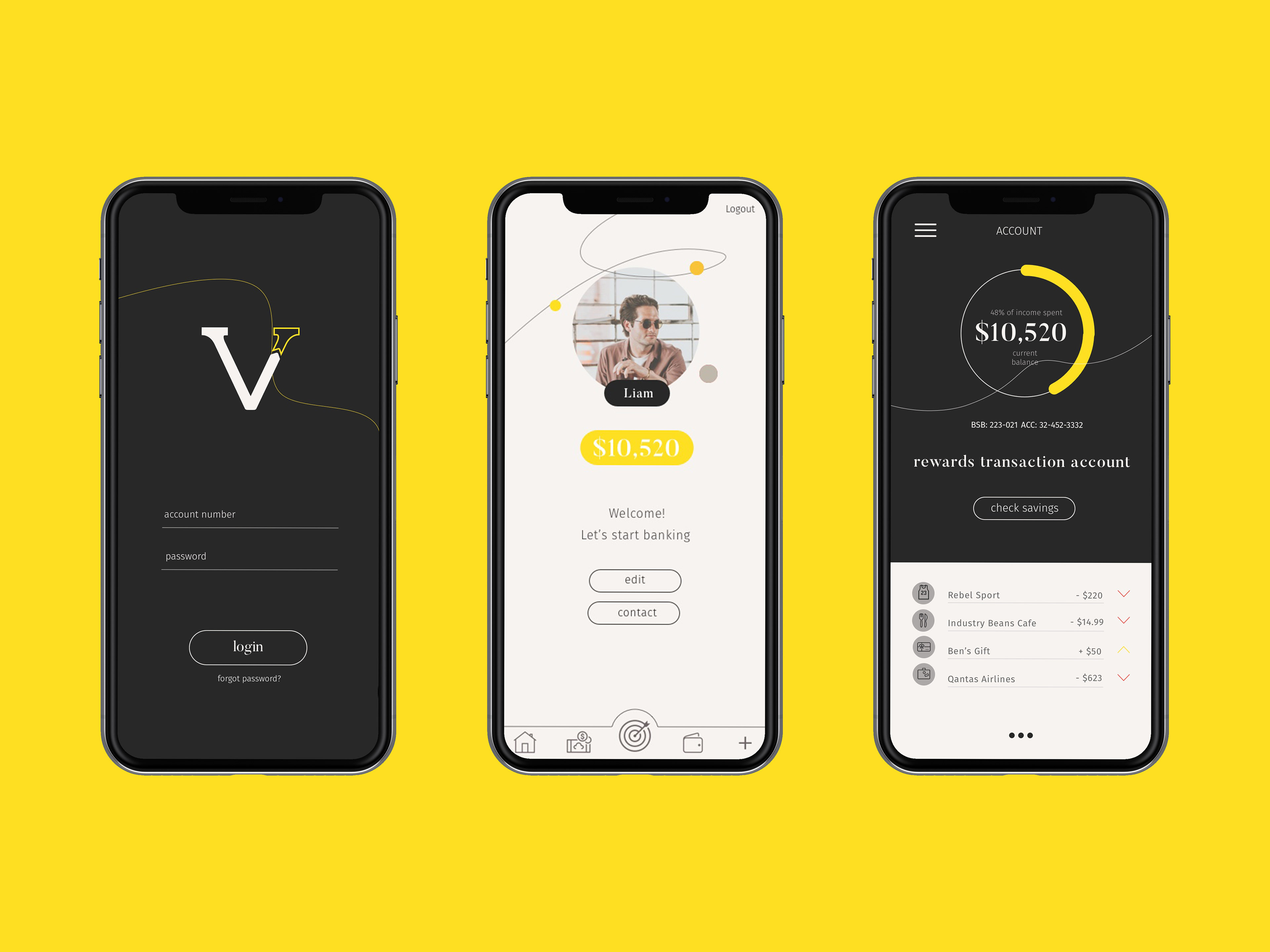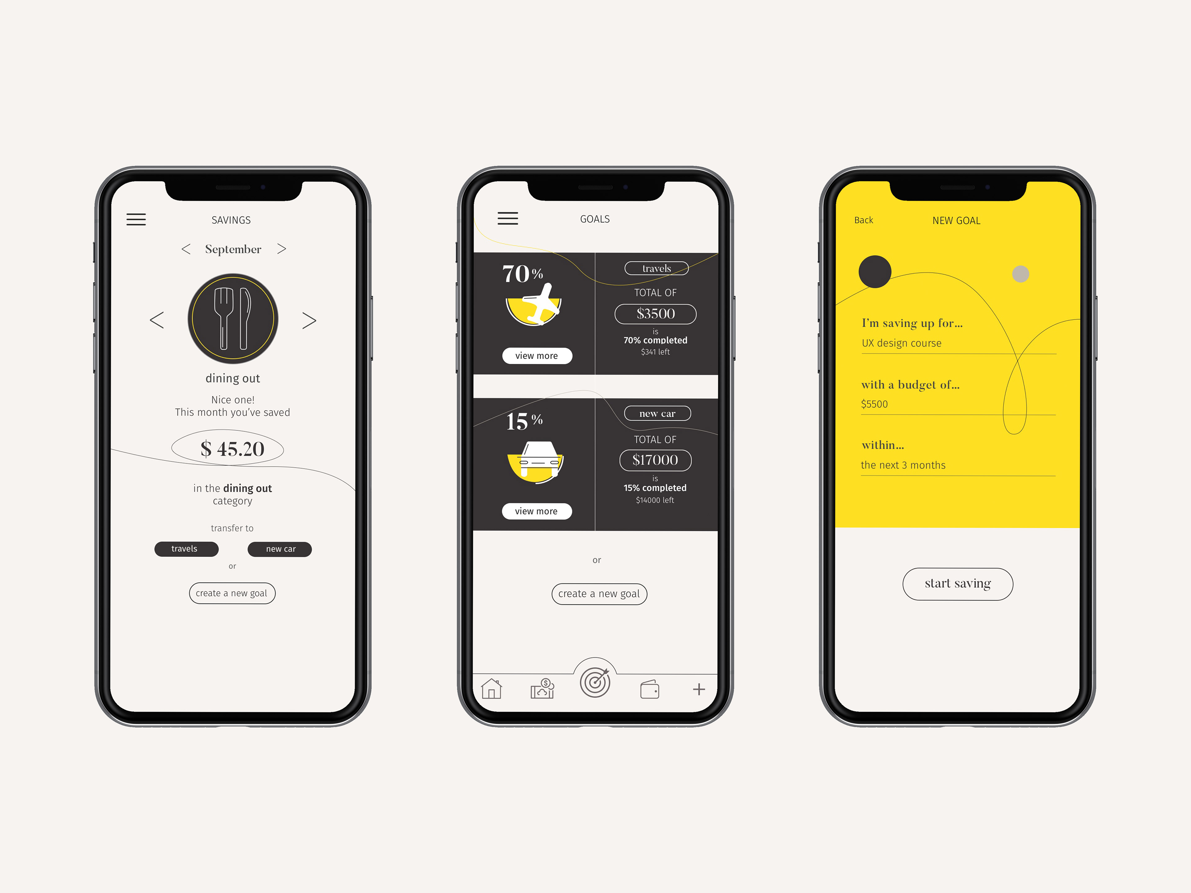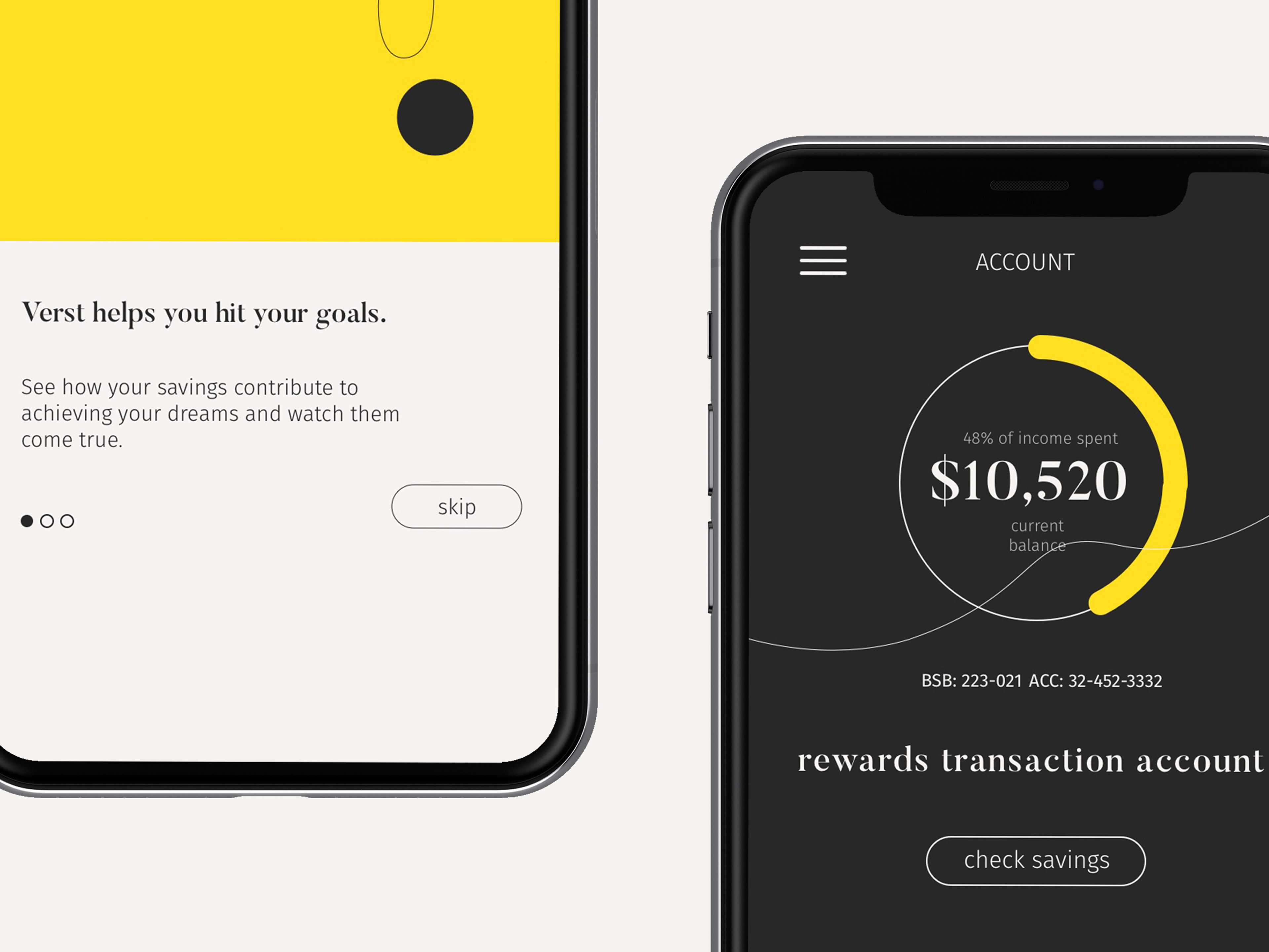 Digital banking app designed to help young professionals easily hit their goals and stay on top of their budget. The idea was to design an app that is not overly complicated and visually pleasing, with a vibrant colour palette and a serif typeface that gives the brand a more mature feel. Curved line element reflect the ease that the app brings to finance management.